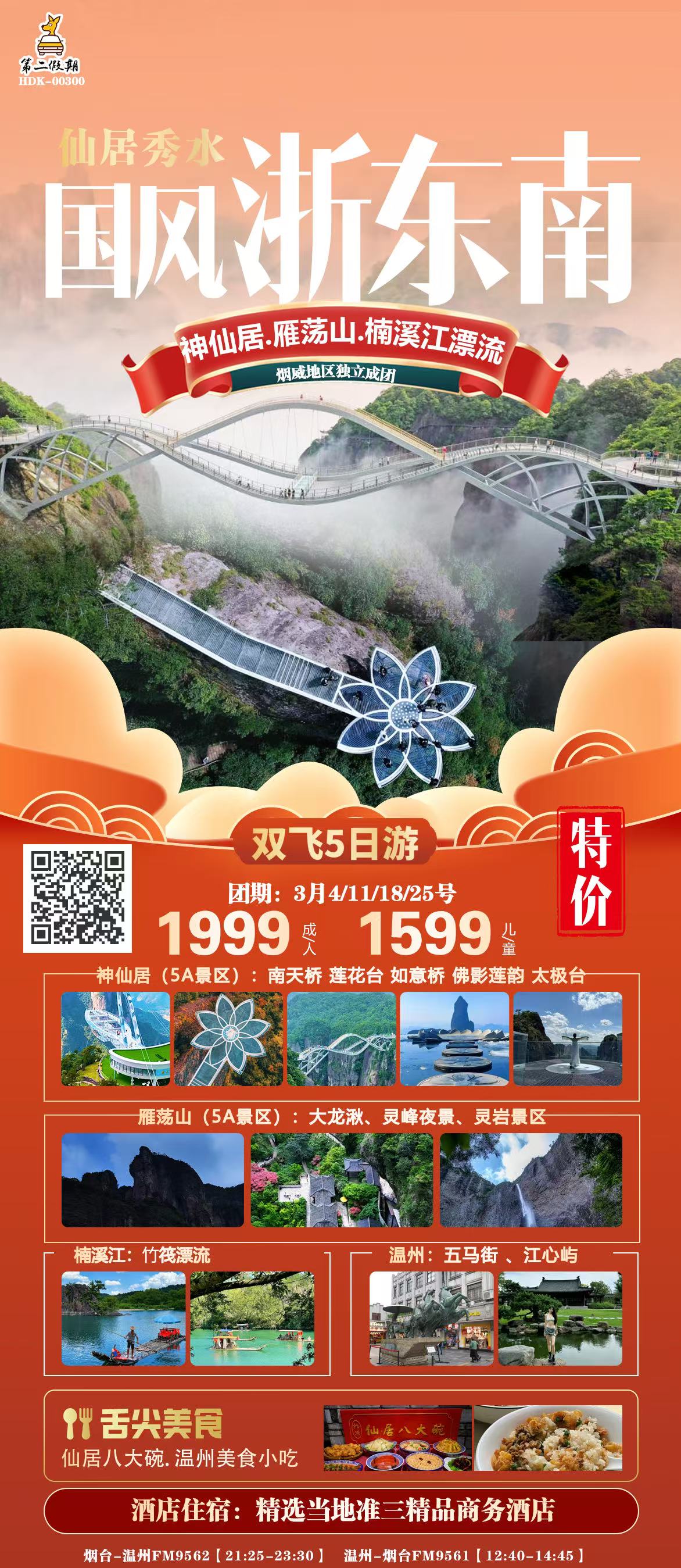 线路名称:🐿️雁荡山●神仙居●楠溪江漂流【国风浙东南】双飞5天