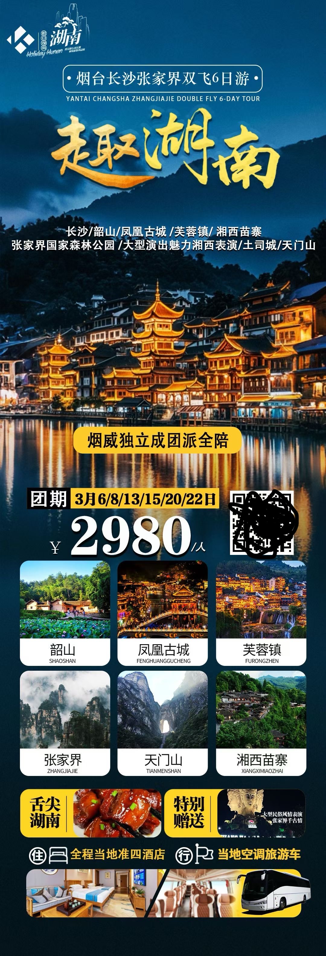 【趣长沙】烟台直飞长沙双飞6日游 ❤️烟威独立成团 ❤️满20人升级2+1用车 ❤️满25人派全陪 1️⃣感受烟火长沙,经略山水一色 2️⃣走进革命圣地,参观伟人故居 3️⃣景区必坐小交通一价全含0自费 4️⃣拒绝两山连走:森林公园、天门山分开进入 5️⃣王牌+网红景点一网打尽,赠1500万人都看过的价值268的《魅力湘西》 6️⃣网红打卡.新地标:中国最绝美的芙蓉古镇和中国最浪漫的凤凰古城