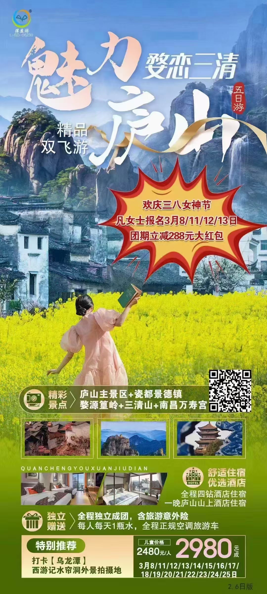 线路名称:春暖花开,相约魅力庐山! 经典纯玩双飞五日游