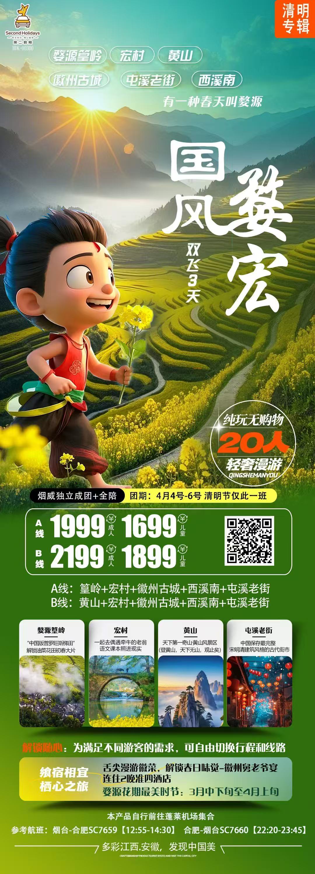 清明节🌐婺源/黄山➕宏村➕西溪南➕徽州古城➕屯溪老街【双飞3天 】