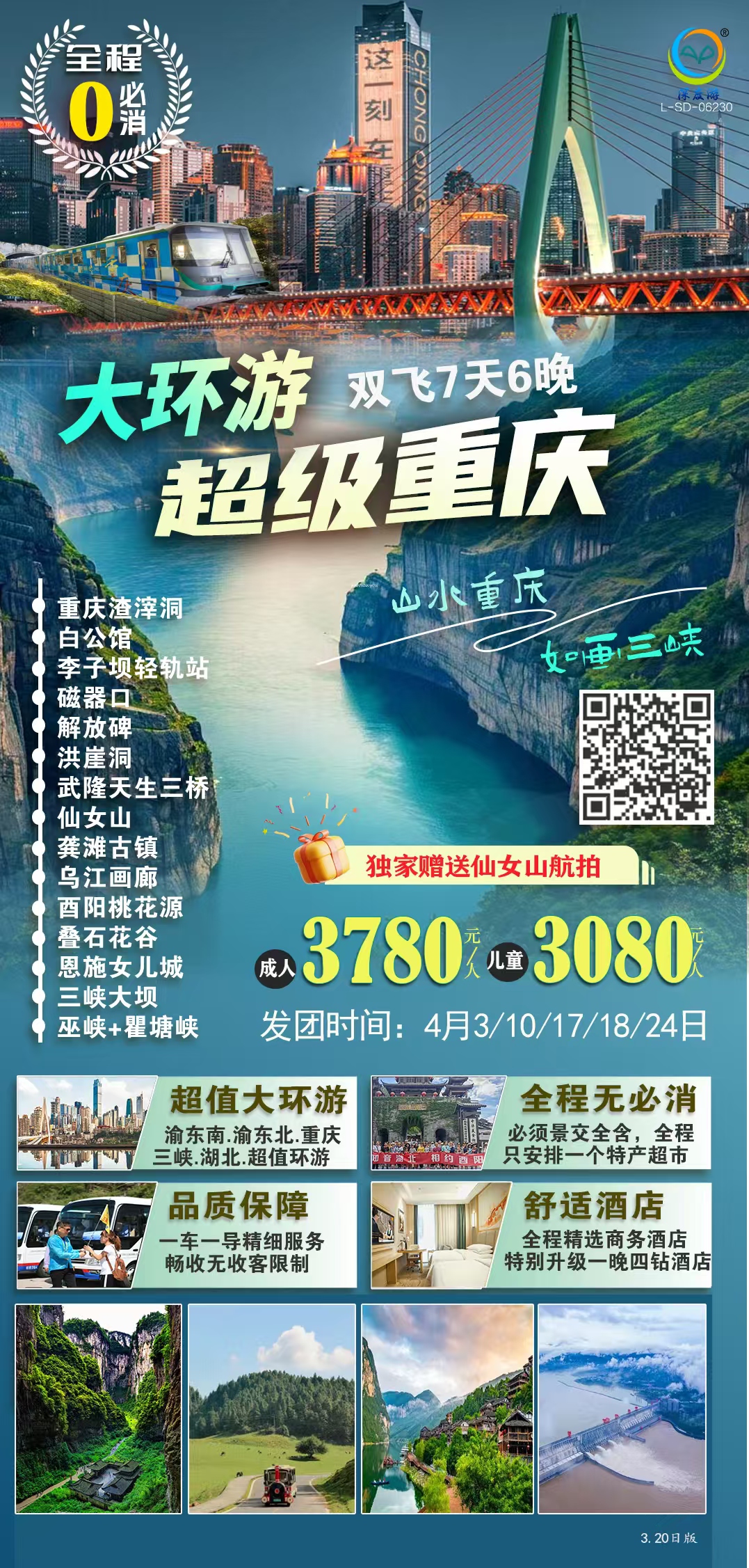 线路名称:超值【重庆大环游】渝东南+渝东北+重庆市区+三峡+湖北 !烟台出港双飞7日游