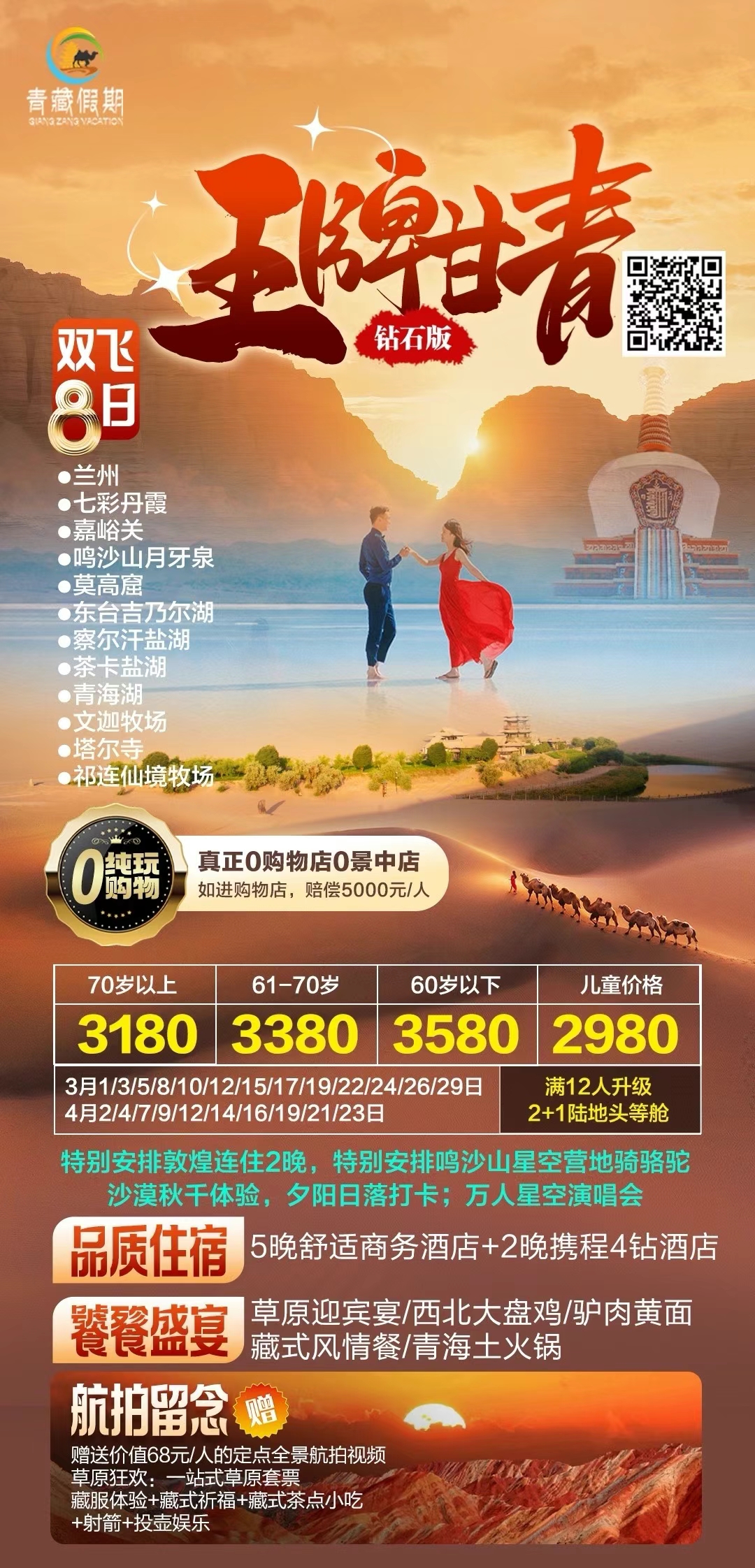 线路名称:《王牌甘青》——青甘大环线纯玩双飞8日游
