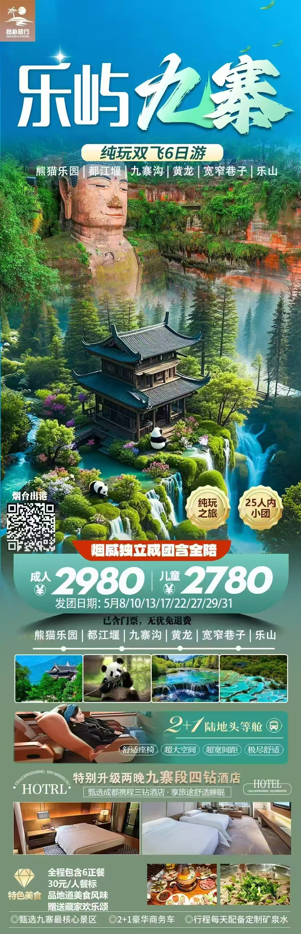 ⛰九寨沟➕黄龙➕都江堰➕熊猫乐园➕宽窄巷子➕乐山