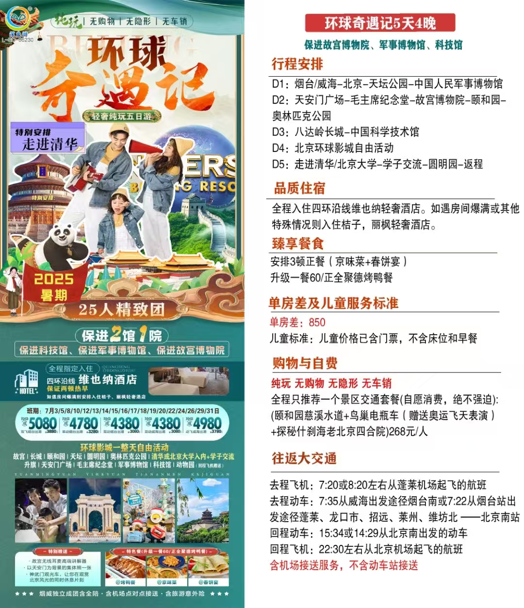 🎬 烟威独立成团、赠送故宫耳麦、神武门观光车、旅游意外险、集体照、含机场接送
