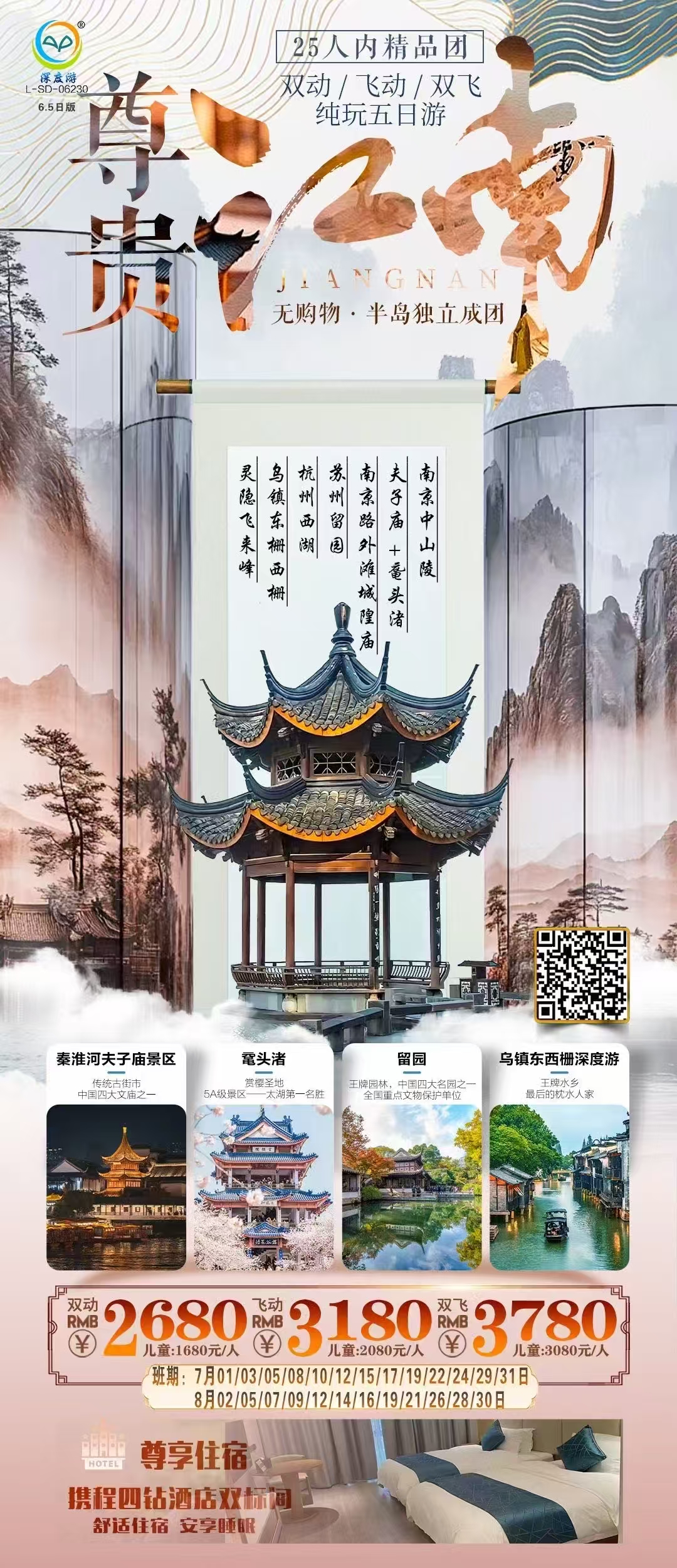 7月/5/8/10/12/15/17/19/22/26/29尊贵江南五日游