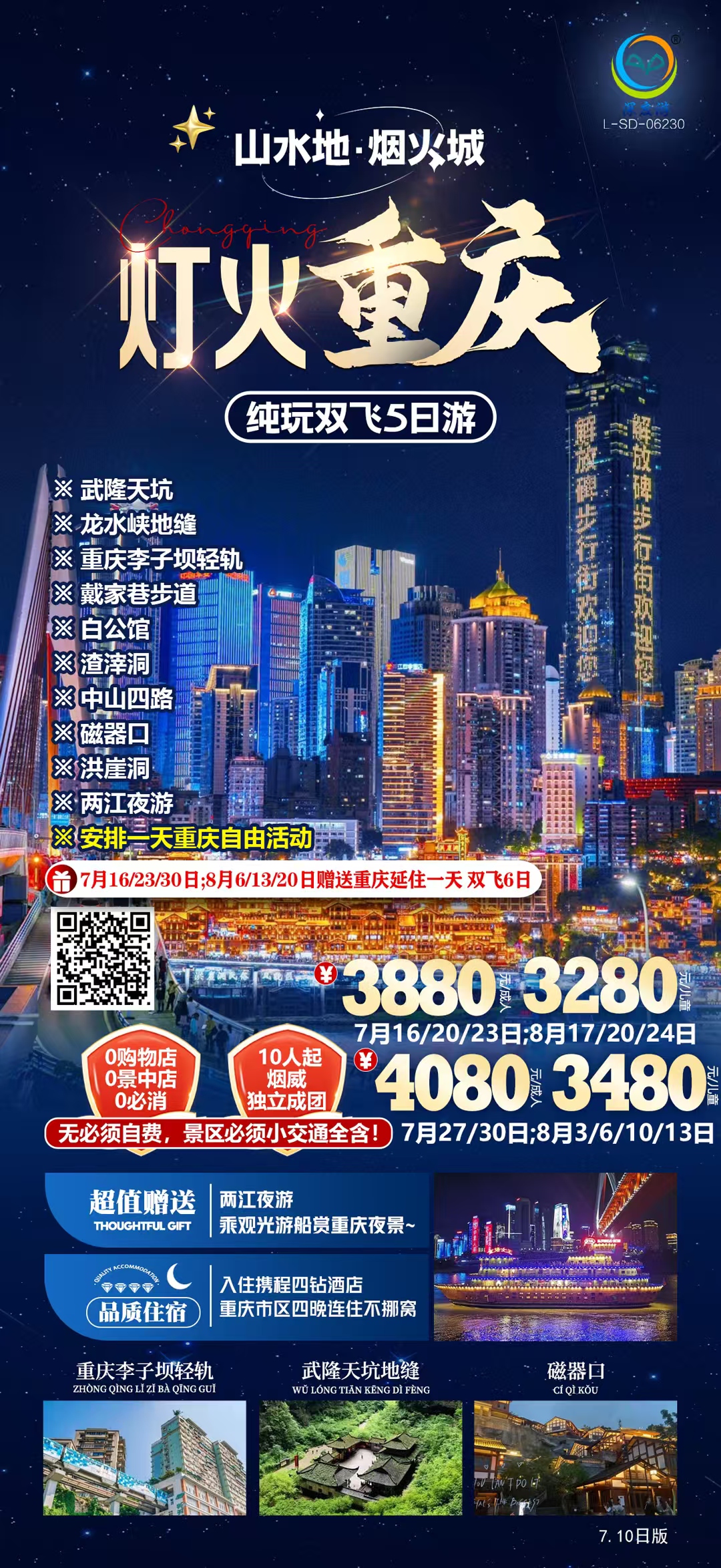 7月16、23号有位双飞6日 赠送一天重庆自由行