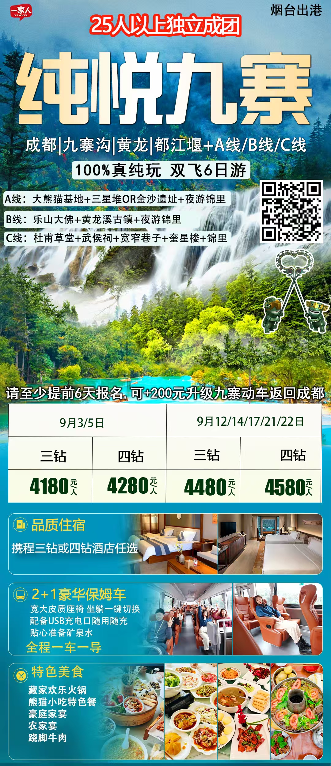 线路名称:💯真纯玩💯【四川·纯悦九寨】双飞6天