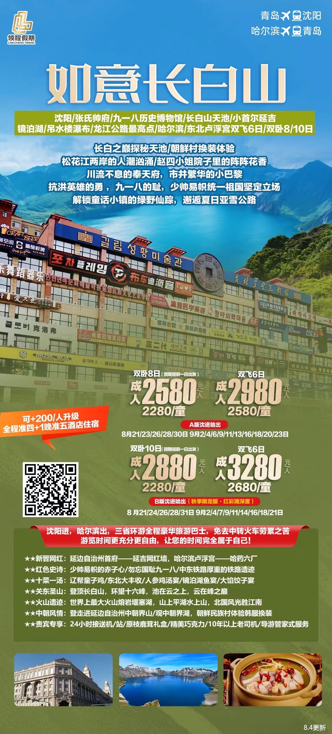 👍沈阳/张氏帅府/九一八历史博物馆/长白山天池/小首尔延吉镜泊湖/吊水楼瀑布/龙江公路最高点/哈尔滨/东北卢浮宫双飞6日/双卧8日小环线全景游‼️