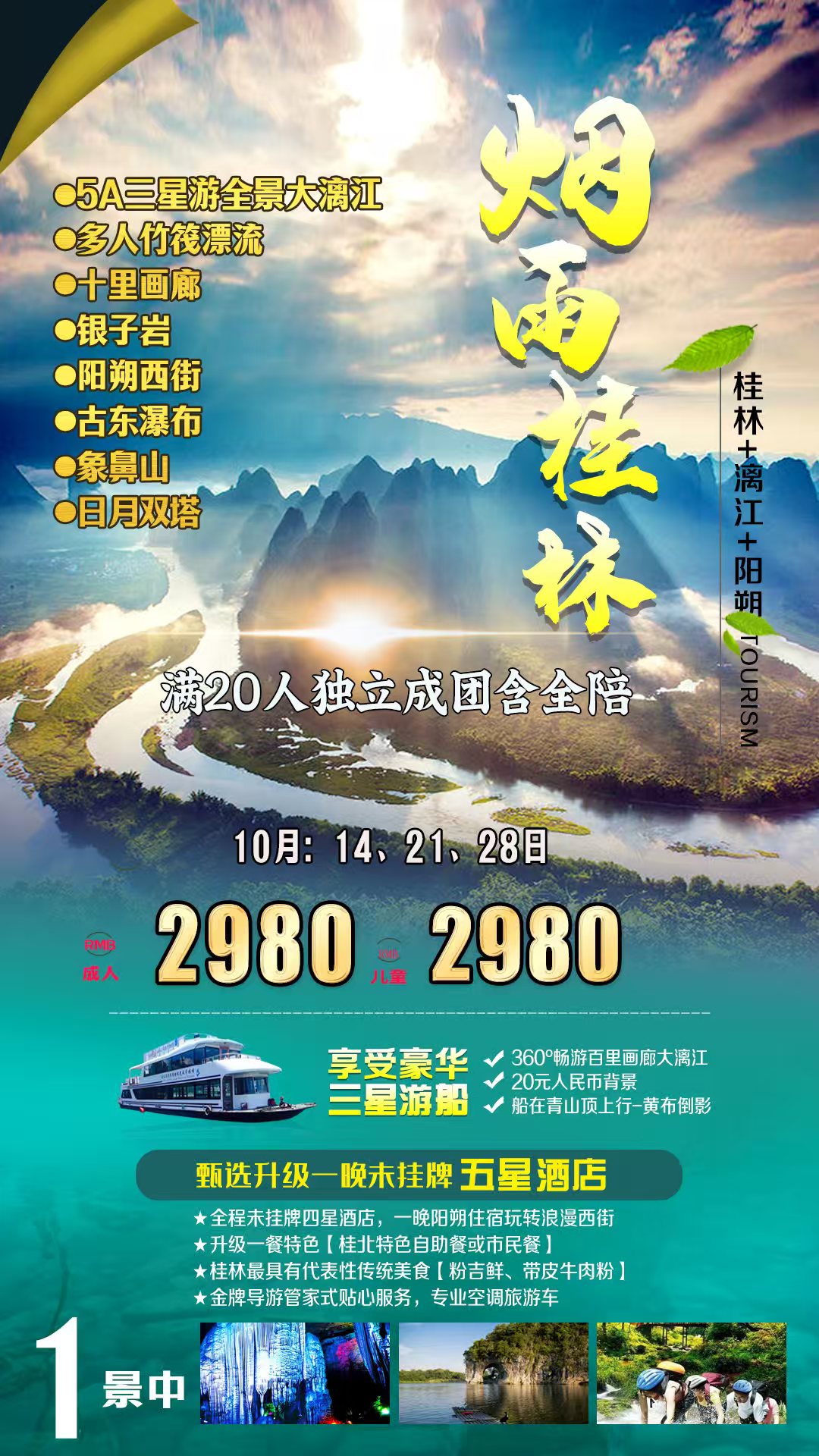 🚢三星大漓江游船4小时饱览大漓江全景九马画山,20人民币背景等美景!