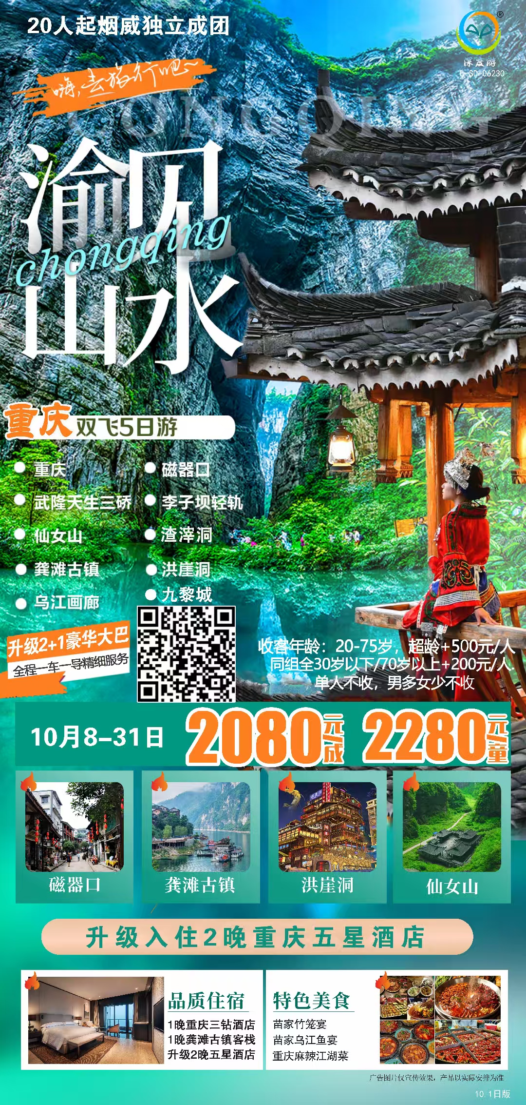 特价[跳跳][跳跳]【渝见山水】重庆双飞5日游