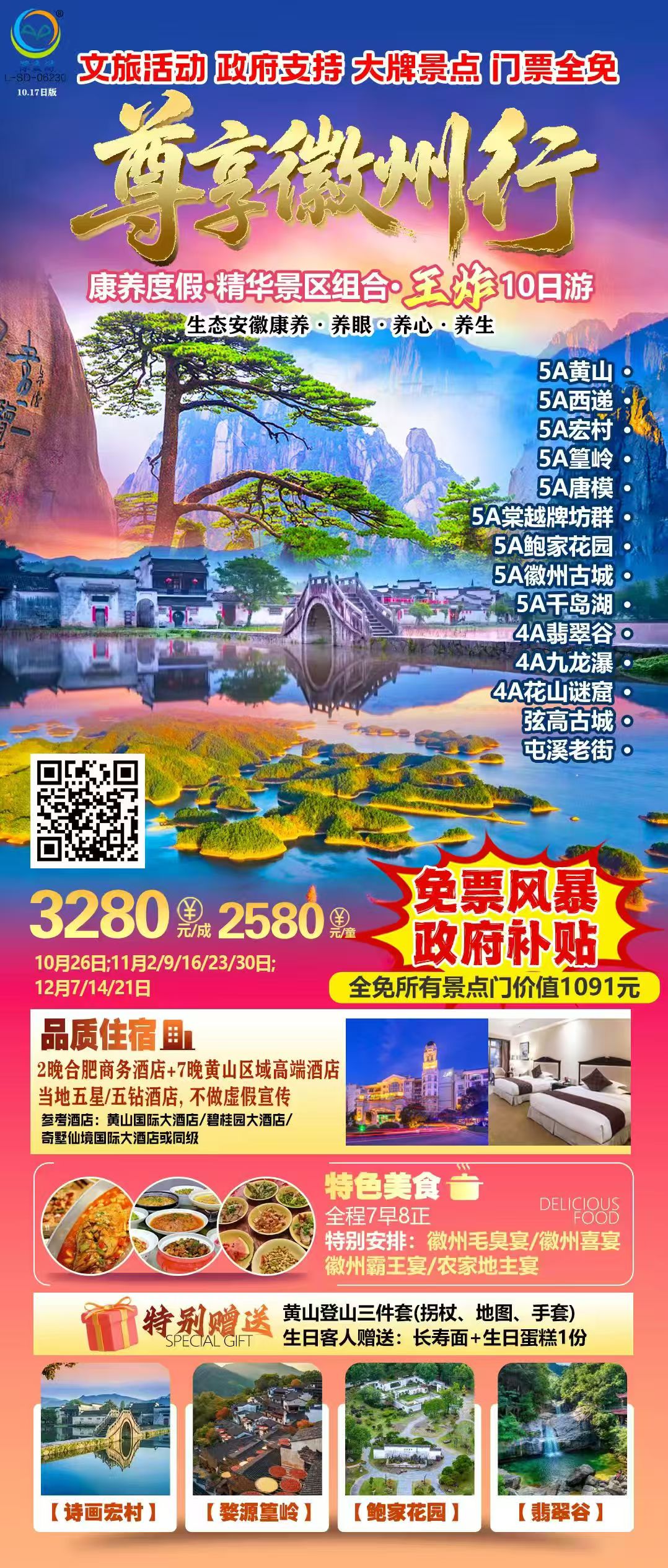 5A黄山🌺5A西递🌺5A宏村🌺5A篁岭·🌺5A唐模🌺5A棠越牌坊群🌺5A鲍家花园·🌺5A徽州古城🌺5A千岛湖🌺4A翡翠谷🌺4A九龙瀑·🌺4A花山谜窟🌺弦高古城·🌺屯溪老街🌺塔川秋色深度康养