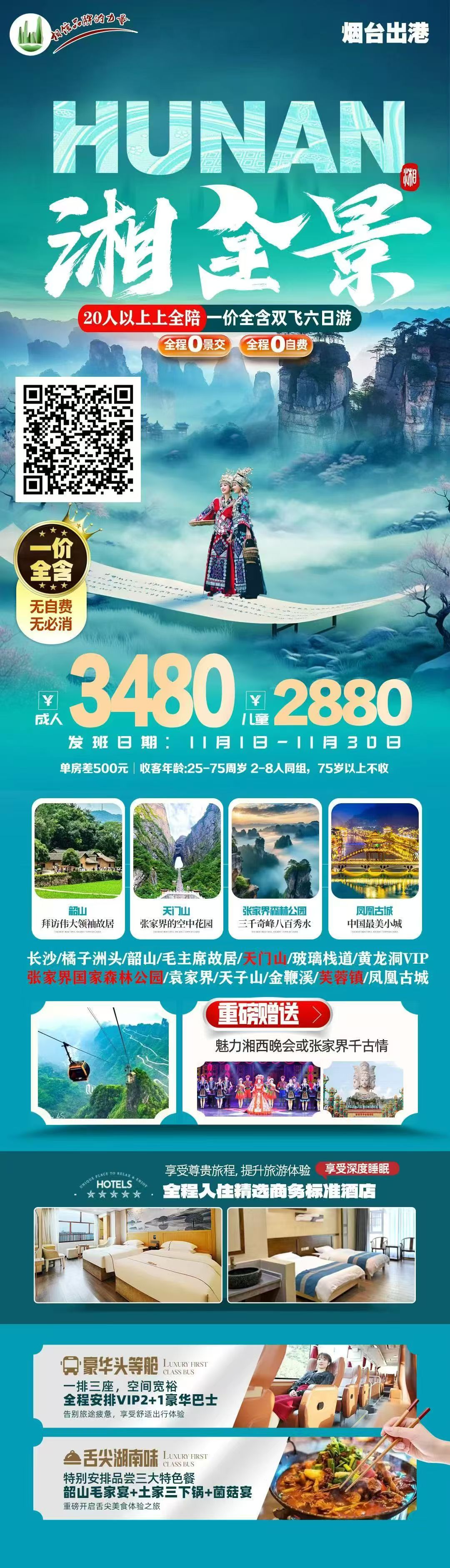 线路名称:烟台出港【湘·全景】长沙张家界吧凤凰双飞六天