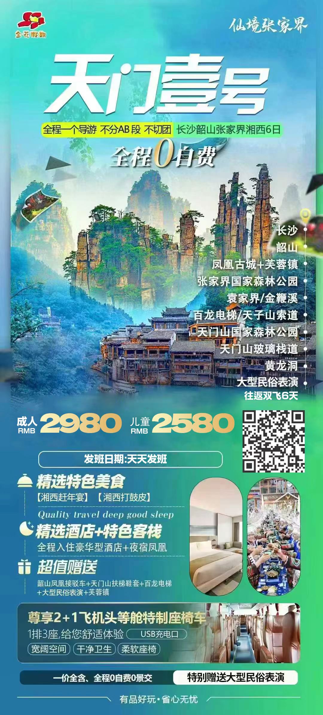 您预订的是:   长沙+韶山+张家界+袁家界+金鞭溪+天子山+天门山+湘西苗寨+凤凰古城双飞6日游