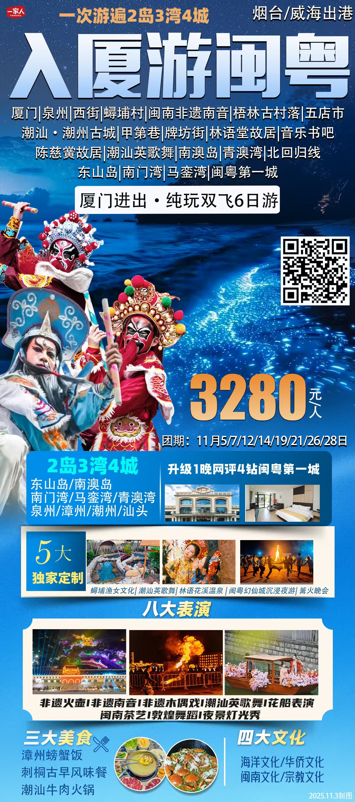 ♥️厦门+林语堂故居+泉州西街+蟳埔村+闽南非遗南音·非遗木偶戏体验·茶道欣赏+梧林古村落+晋江五店市+潮汕·潮州古城+潮汕英歌舞+甲第巷+东山岛+南门湾+马銮湾+闽粤第一城花灯夜游+陈慈黉(hong)故居+南澳岛+青澳湾+北回归线+林语花溪温泉……
