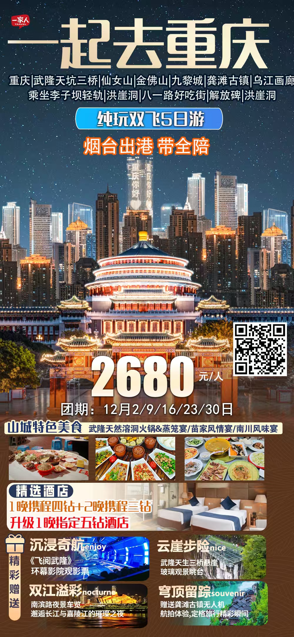 🔥烟台出港,带全陪‼️12🈷️2/9/16/23/30(跨元旦)号,💯纯玩【一起去重庆】双飞5天