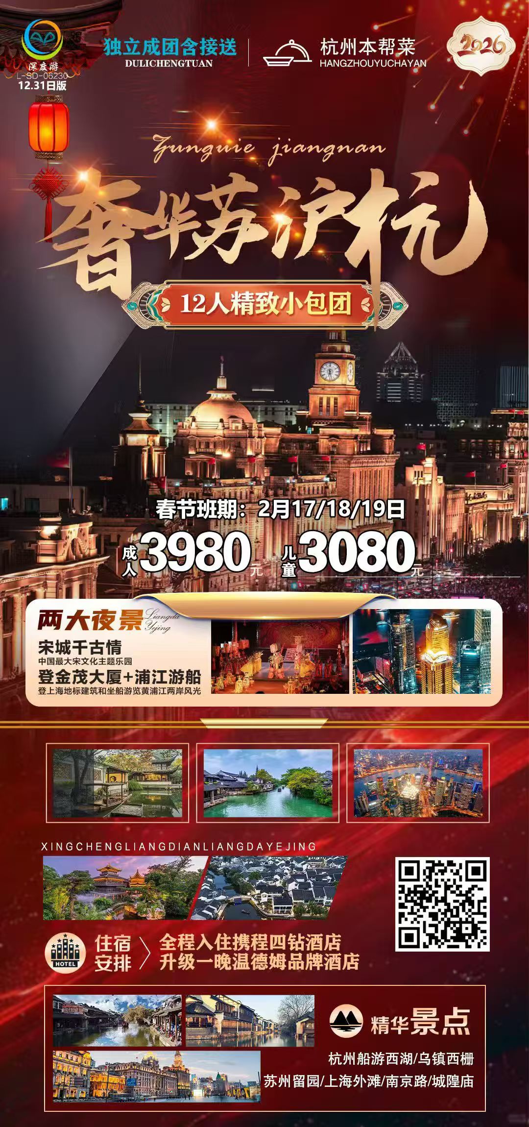 线路名称:奢华苏沪杭 · 2026春节双飞四天