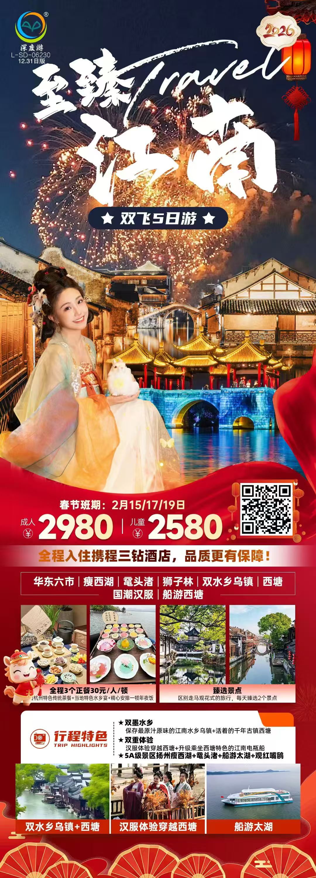 线路名称:🏮 春节江南全景漫游 · 至臻江南双飞5日 🏮