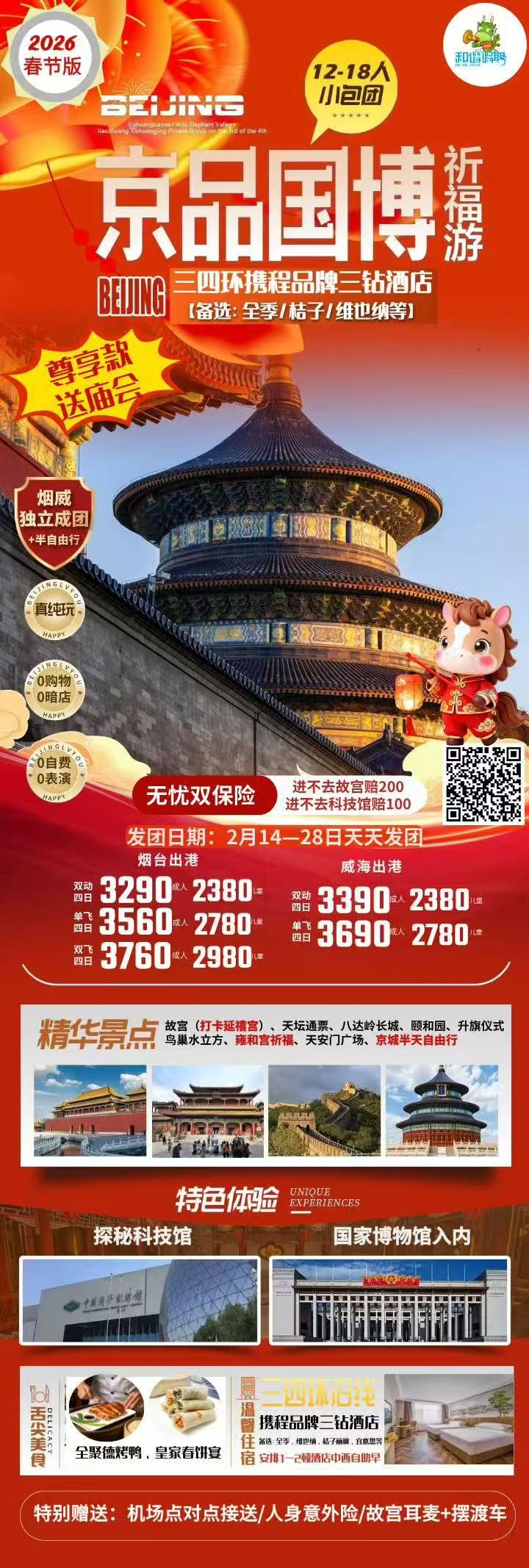 您预订的是:   春节北京~尊享版~京品国博双动四天