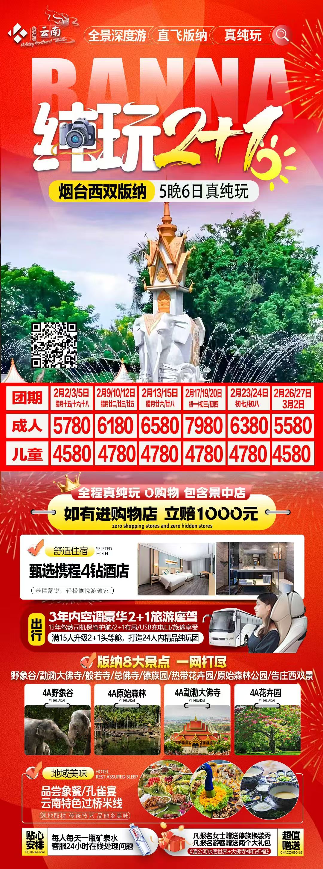 线路名称:【纯玩2+1】烟台直飞版纳纯玩双飞六天