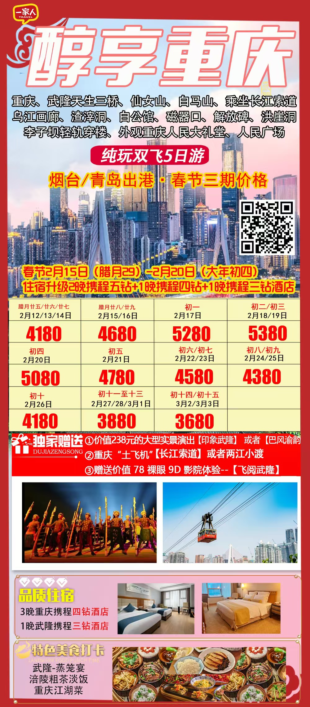 [福]春节[福]真纯玩💯品质【醇享重庆】双飞5天