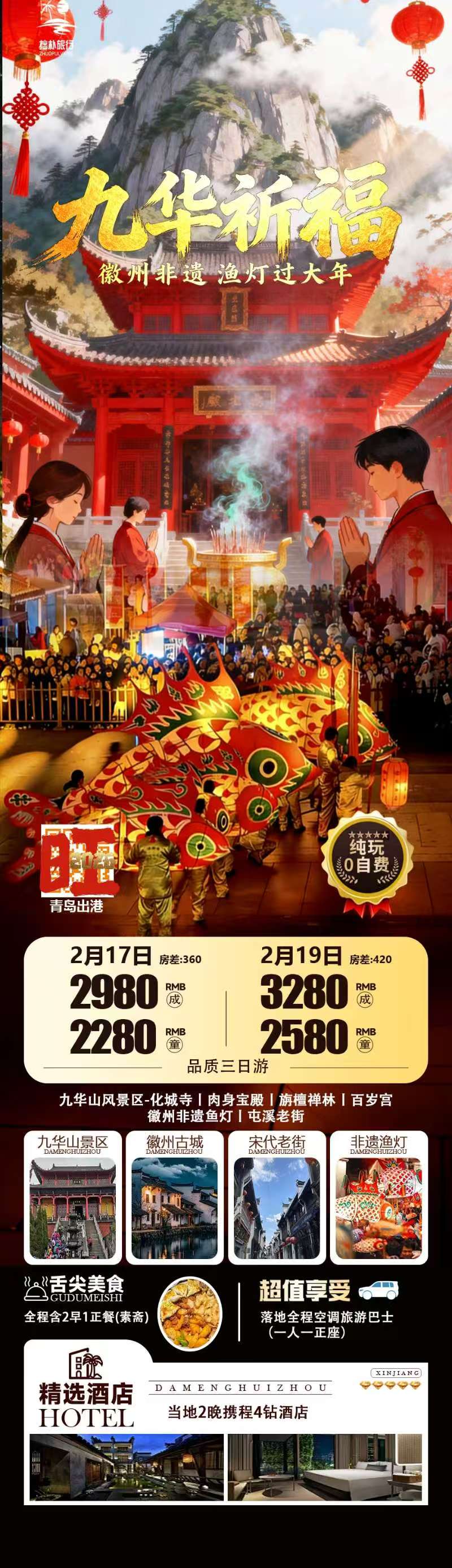 线路名称:正月九华祈福|跟着非遗渔灯过个热闹大年九华山3日纯玩之旅-