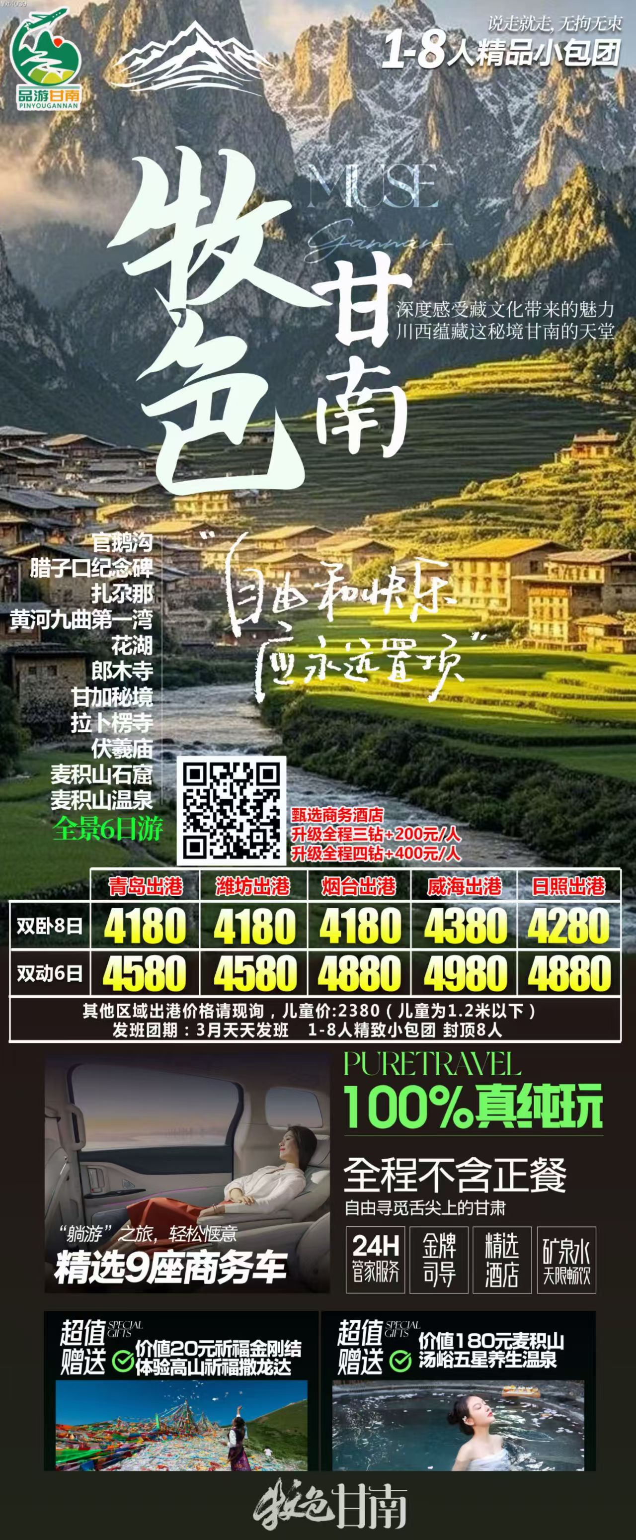 精华景点:官鹅沟+腊子口纪念碑+扎尕那+花湖+黄河九曲第一湾+郎木寺+拉卜楞寺+甘加秘境+伏羲庙+麦积山石窟