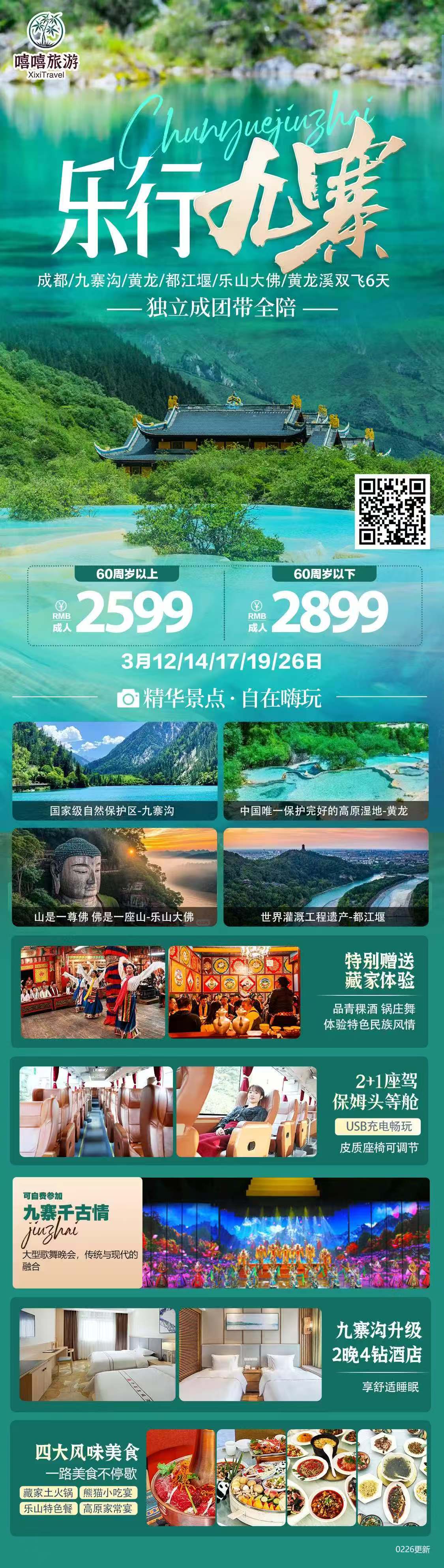 线路名称:成都+九寨+乐山+黄龙+黄龙溪双飞6日