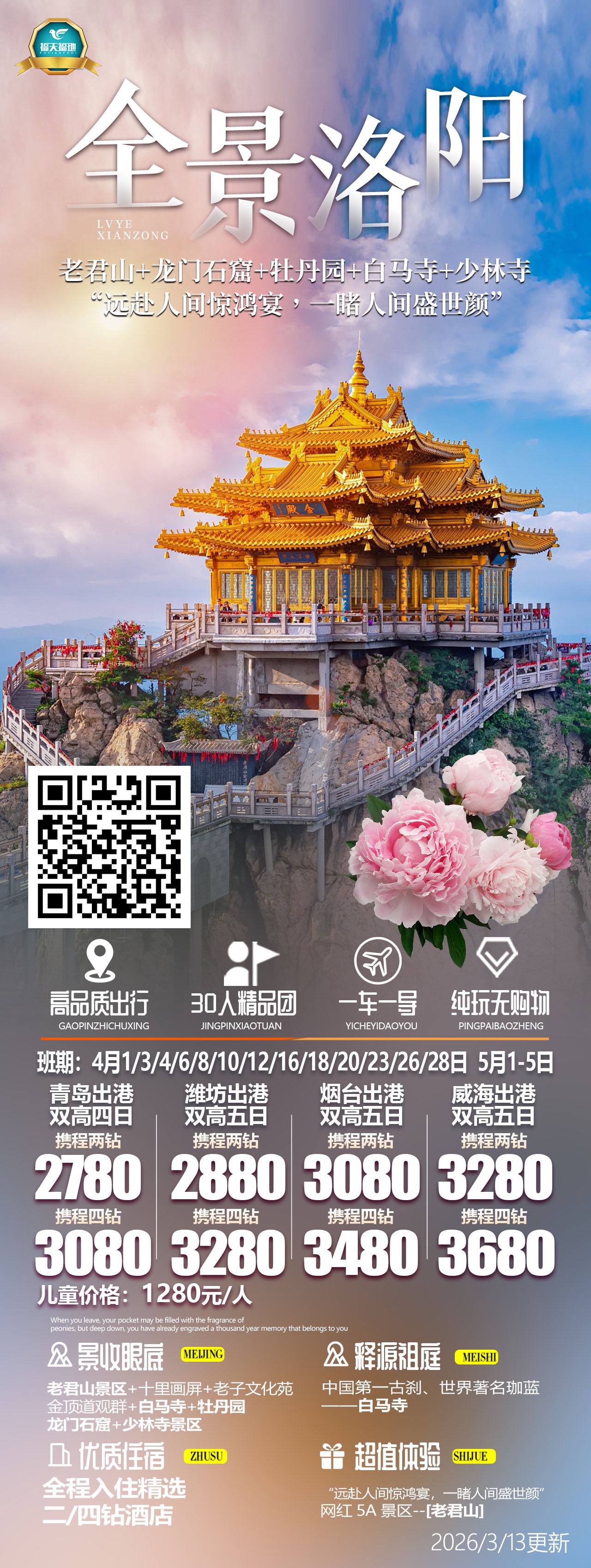 🎯 五大遗产盛宴:老君山+少林寺+白马寺+龙门石窟+博物馆(牡丹园)