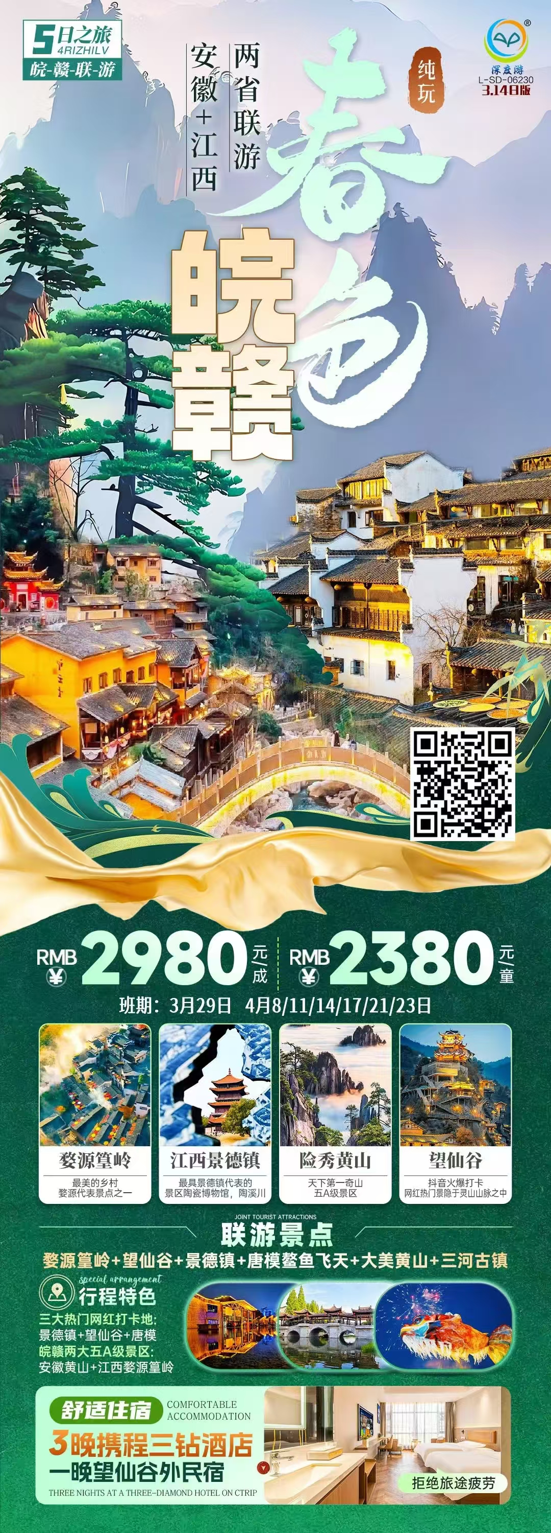线路名称:春色皖赣江西➕安徽两省联游双飞五天