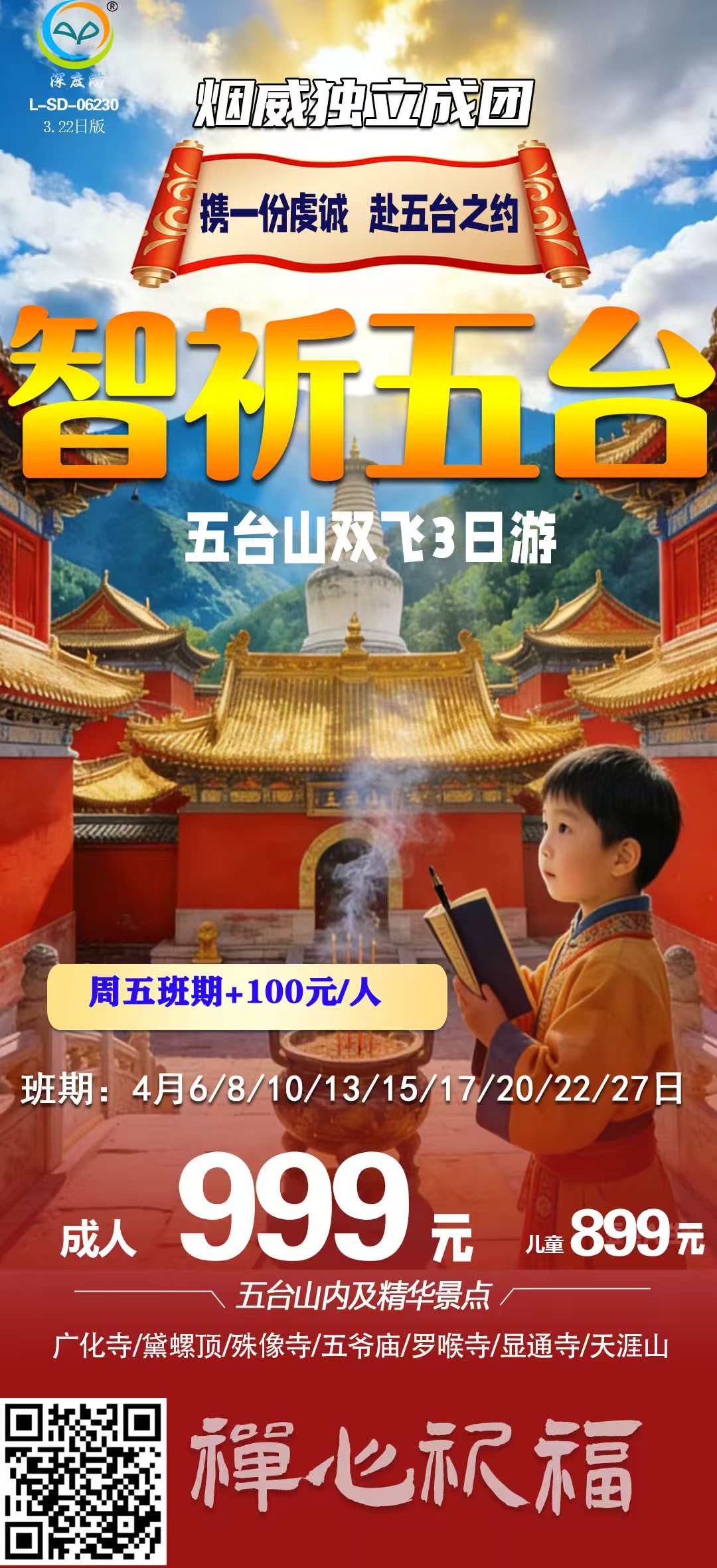 [爱心]携一份虔诚,赴一场五台之约!烟威独立成团,双飞3日直达佛国秘境,让身心在梵音与青山间彻底安放。