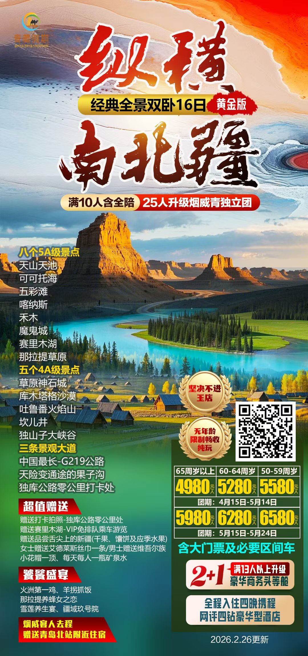 您预订的是:   2026纵横东西南北疆经典全景双卧16日